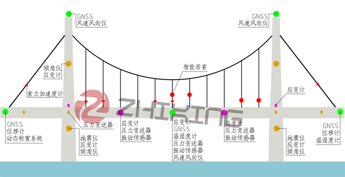 懸索橋主要監(jiān)測內(nèi)容:車輛荷載、風(fēng)速風(fēng)向、溫濕度、地震/船撞、結(jié)構(gòu)振動、空間變位、主梁撓度、傾斜、伸縮縫位移、錨碇位移、結(jié)構(gòu)應(yīng)變、吊索索力