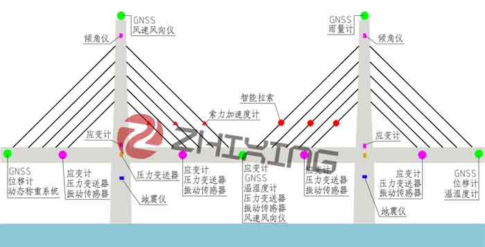 斜拉橋主要監(jiān)測內(nèi)容:車輛荷載、風(fēng)速風(fēng)向、溫濕度、降雨量、地震/船撞、結(jié)構(gòu)振動、空間變位、主梁撓度、傾斜、伸縮縫位移、結(jié)構(gòu)應(yīng)變、斜拉索索力