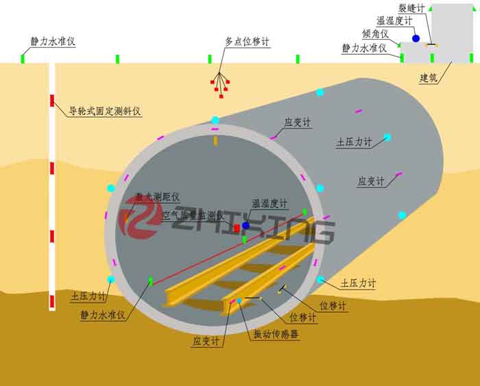 地鐵區(qū)間監(jiān)測主要內(nèi)容:不均勻沉降、凈空收斂與拱頂沉降、伸縮縫張合變形、地表沉降、土體深層分層沉降及水平位移、襯砌/管片應(yīng)力、襯砌圍巖間壓力、隧道內(nèi)環(huán)境溫濕度、隧道內(nèi)有害氣體、鋼軌位移、鋼軌振動、鋼軌應(yīng)變